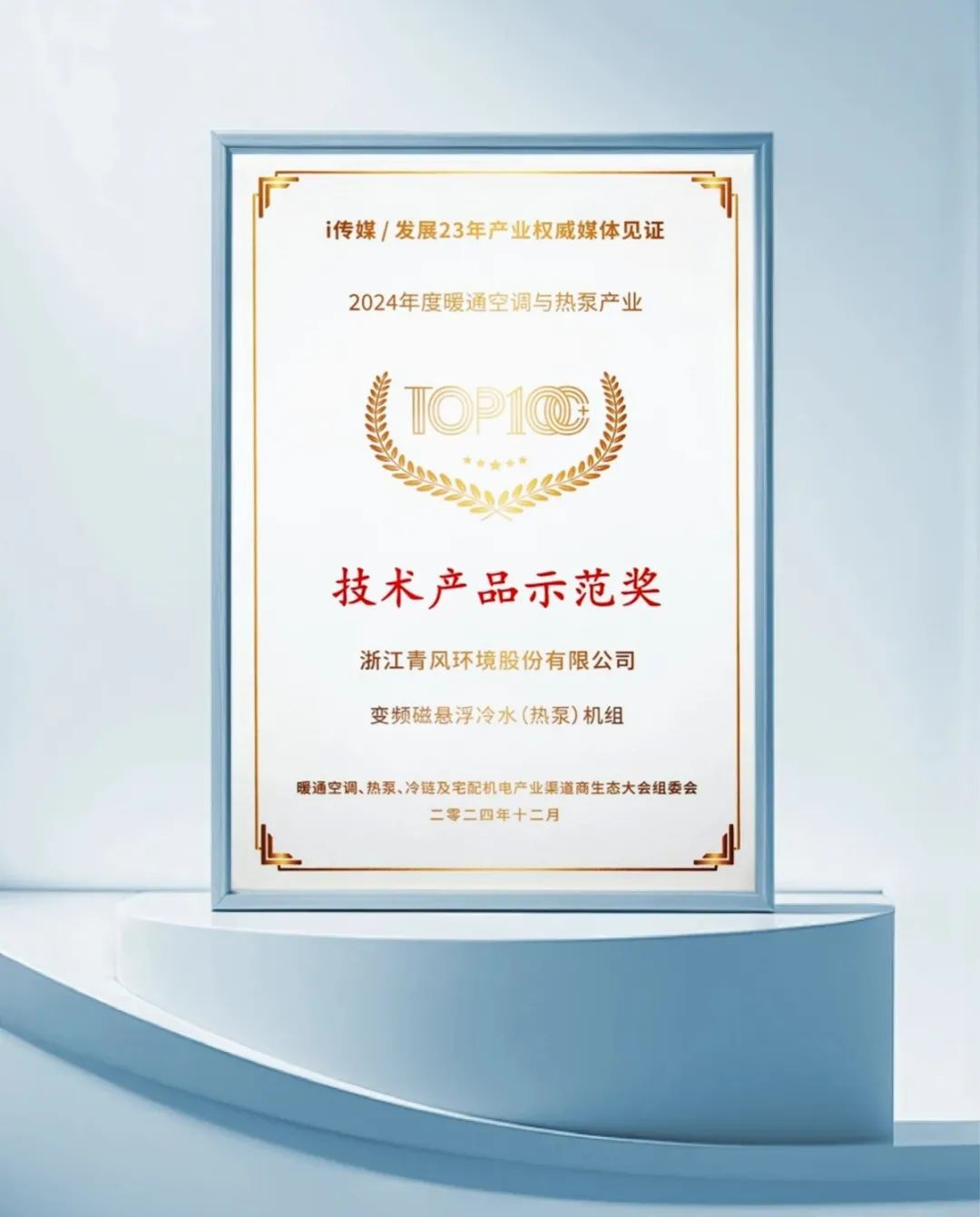 青風變頻磁懸浮冷水(熱泵)機組憑借其高效節(jié)能、穩(wěn)定可靠的產(chǎn)品優(yōu)勢,榮獲大會頒發(fā)的“技術(shù)產(chǎn)品示范獎”。