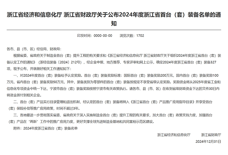 喜訊 | 青風產(chǎn)品入選“2024年度浙江省首臺(套)裝備名單”